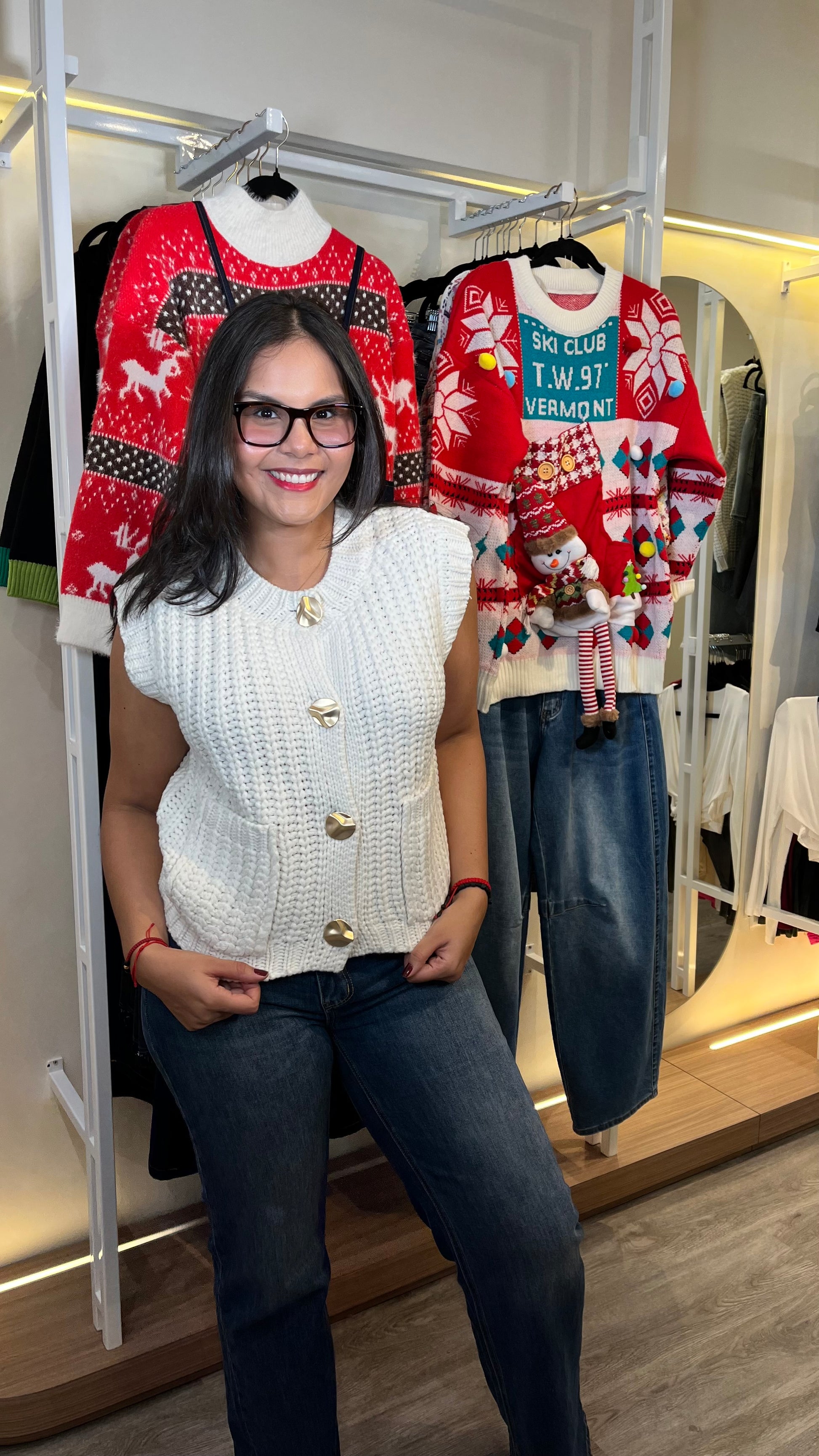 Descripción: Chaleco tejido con botones dorados color Ivory.