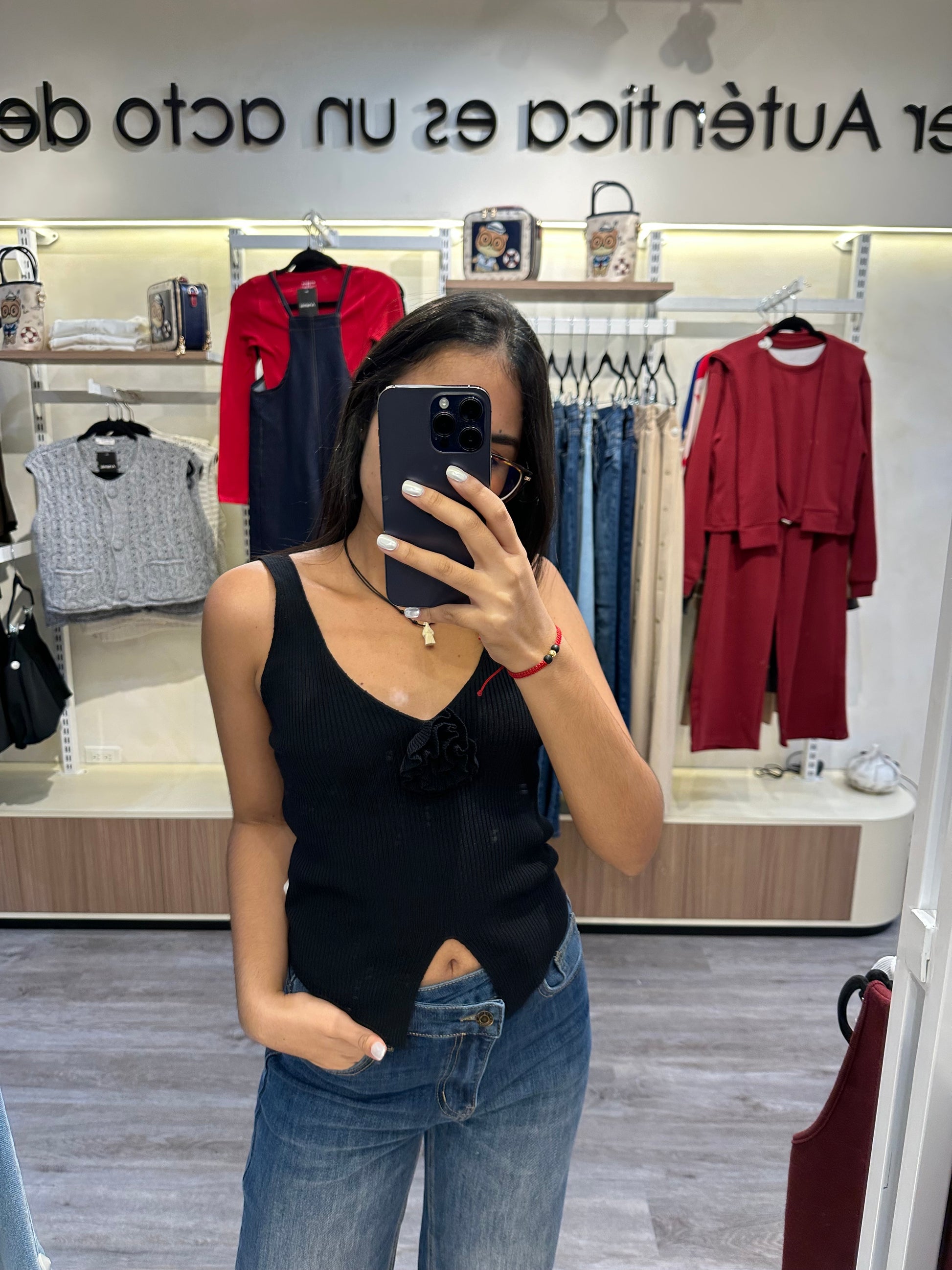 Descripción: Top con detalle de flor y tela tipo acanalada.